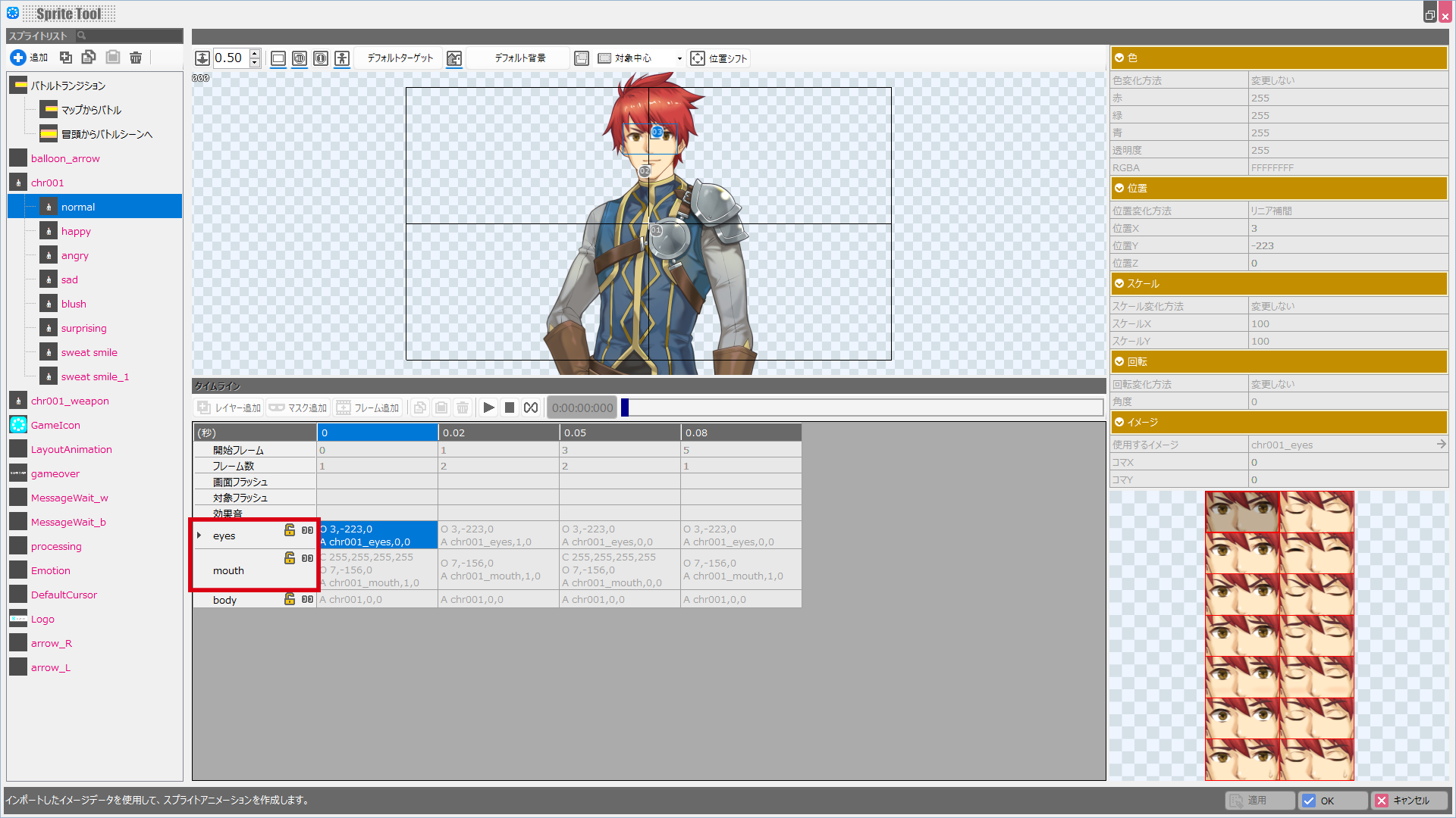 会話イベントなどで使うキャストのデータの作成時、、目パチや口パクのレイヤー名は下記のルールに従ってください。