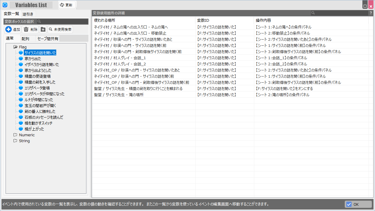行をクリックすると、その変数を使用しているイベントシートが開き、イベントを編集することができます。