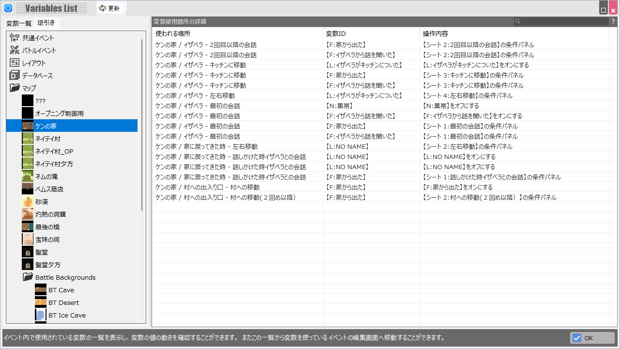 各マップやコモンイベント、レイアウトなどを選択し、そこで使われている変数と変数に対する操作内容を一覧することができます。