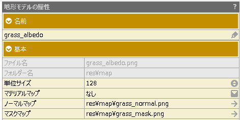 地形プロパティで128に設定されていても、マップ設定の解像度が64だった場合、マップエディター上では64ピクセルで描画されます。