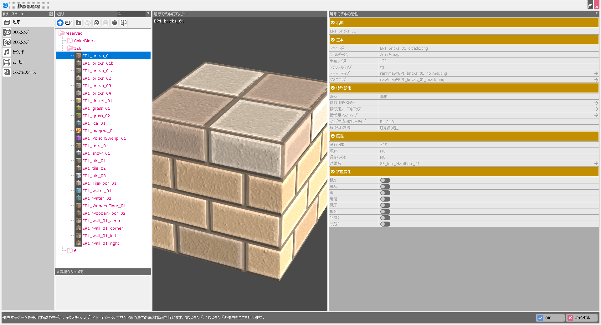 地形ブロックの種別として「地形」「階段」「坂」を選択可能です。
