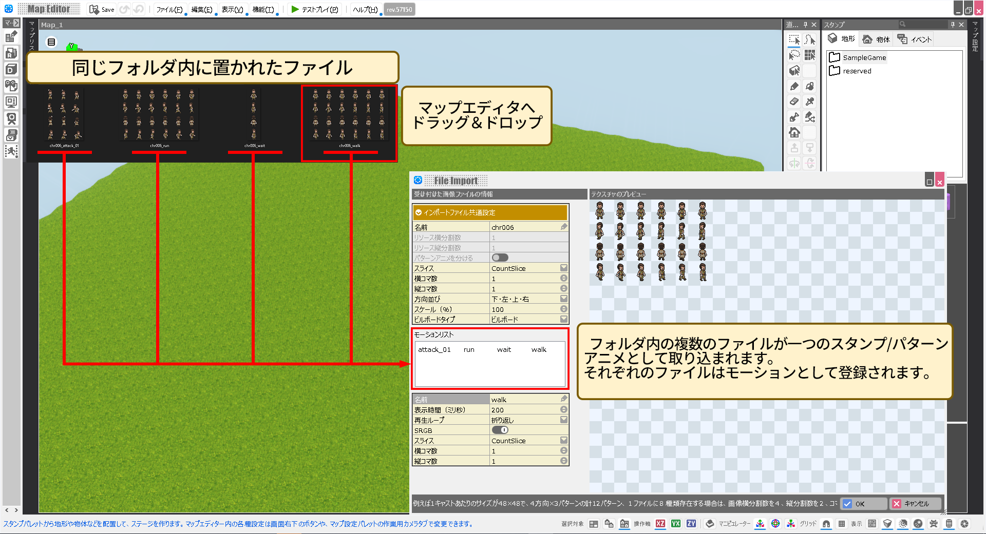 マップエディターに画像をドラッグ&ドロップすることで2Dスタンプが生成されます。