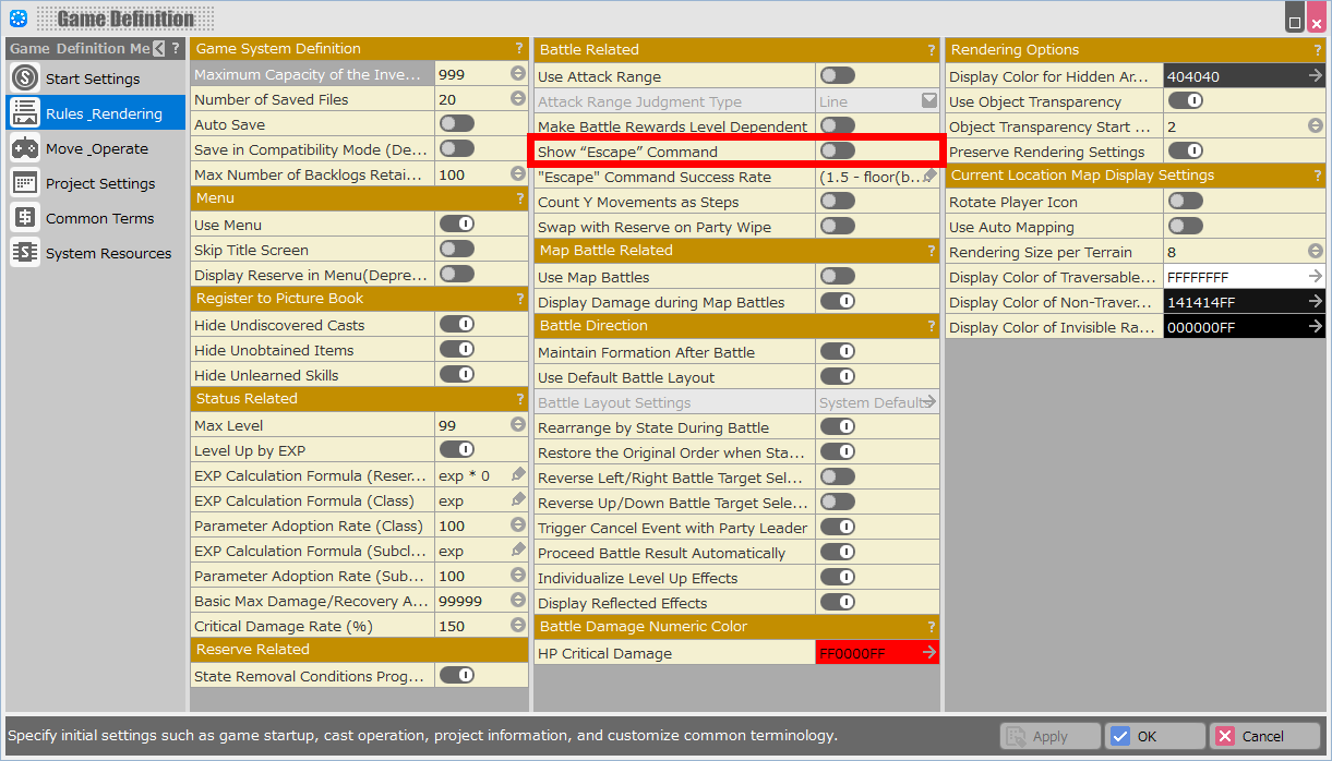 Game Definition > Rules and Rendering > Battle Related> Set “Show ‘Escape’ Command” to Off.