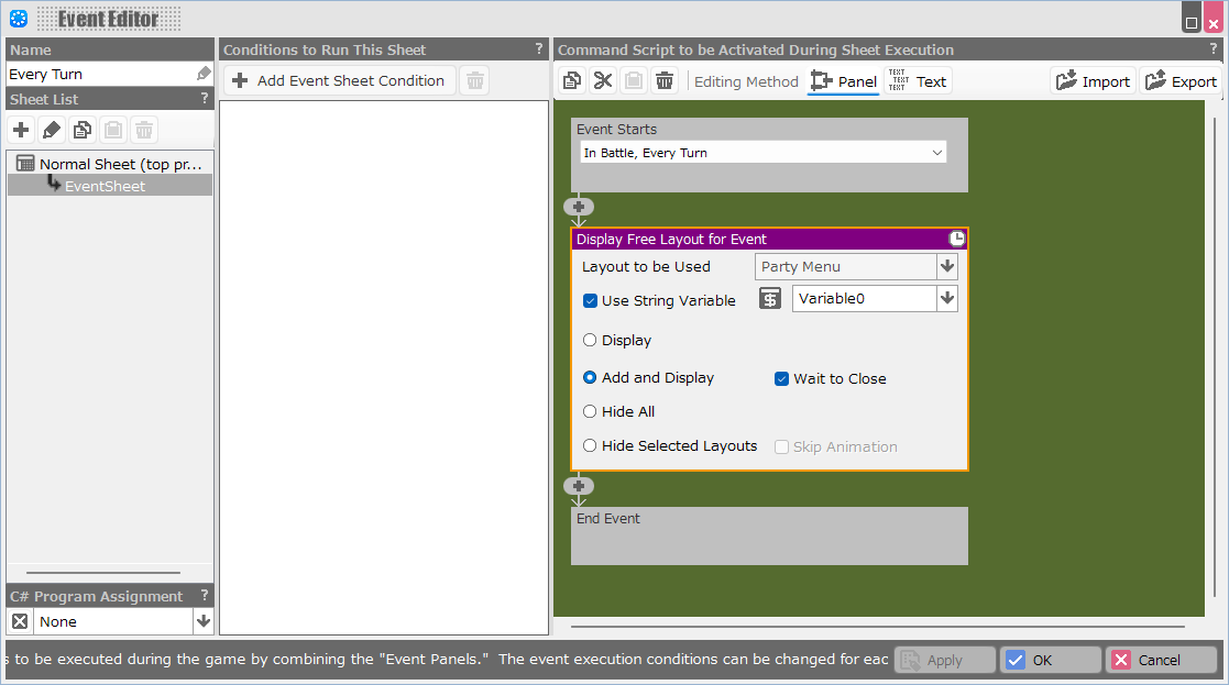 Set the event trigger to “In Battle: Every Turn,” and use the Display Free Layout for Event panel to display the party menu layout created earlier.