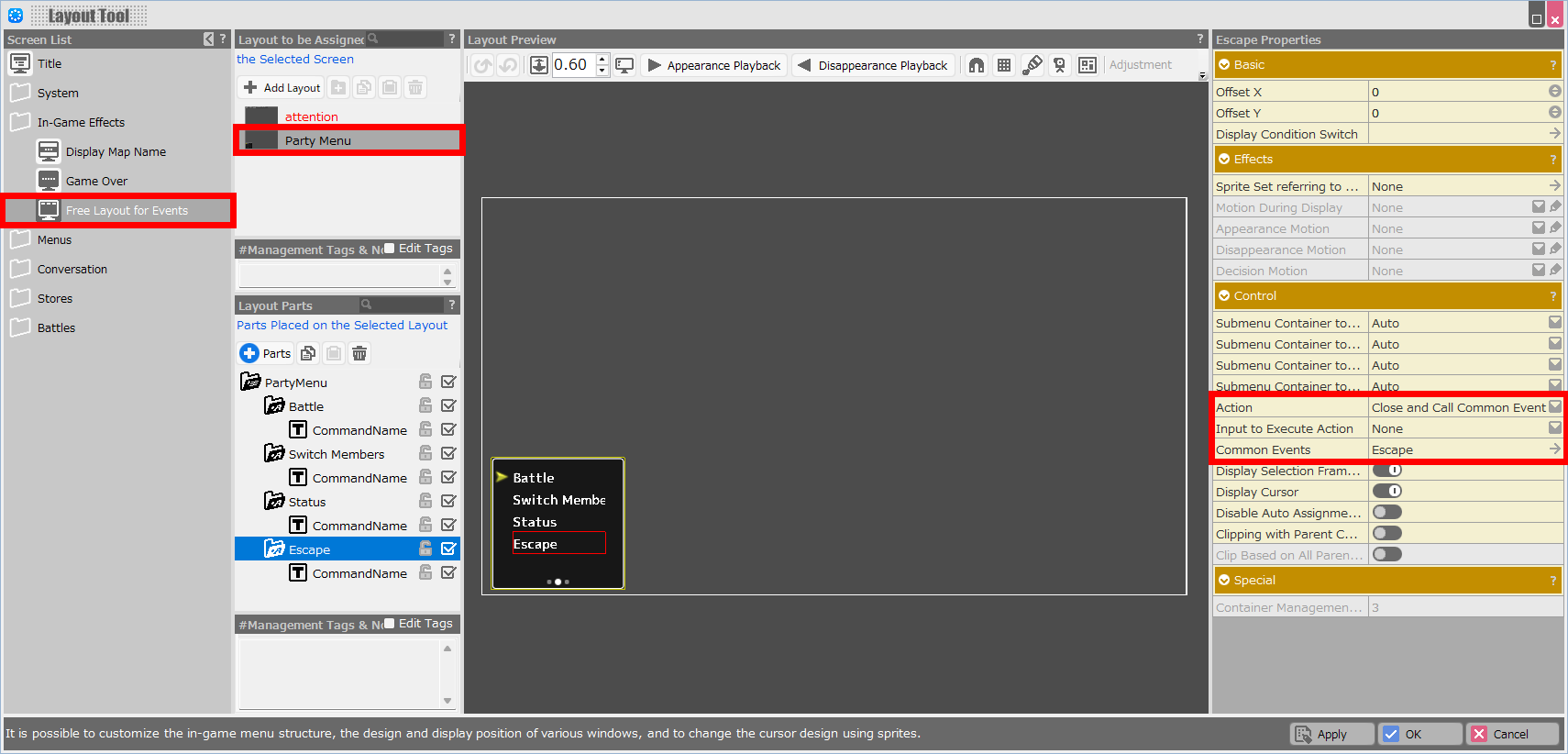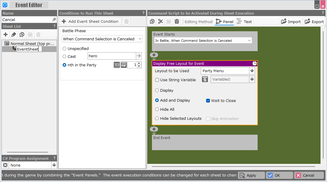 Set the event trigger to “In Battle, When Command Selection is Canceled,” and use the Display Free Layout for Event panel to display the party menu layout created earlier.
