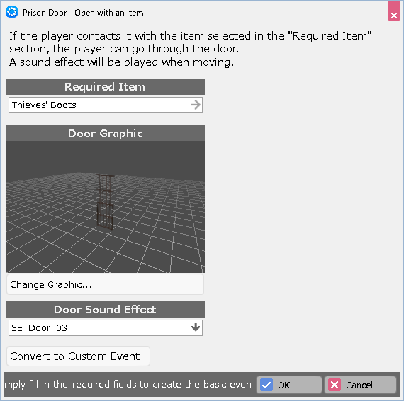 Select the "Required Item to Pass," specify the graphic for the event, and the dialogue for each situation.