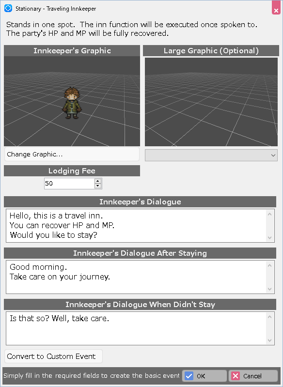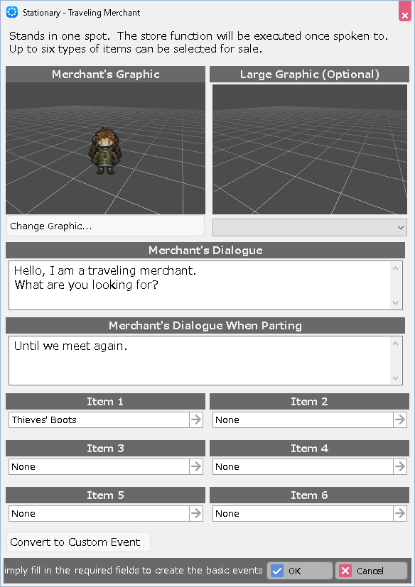 Specify the "Item to be Exchanged" and "Item to be Given," as well as the graphic for the event and the dialogue for each situation.