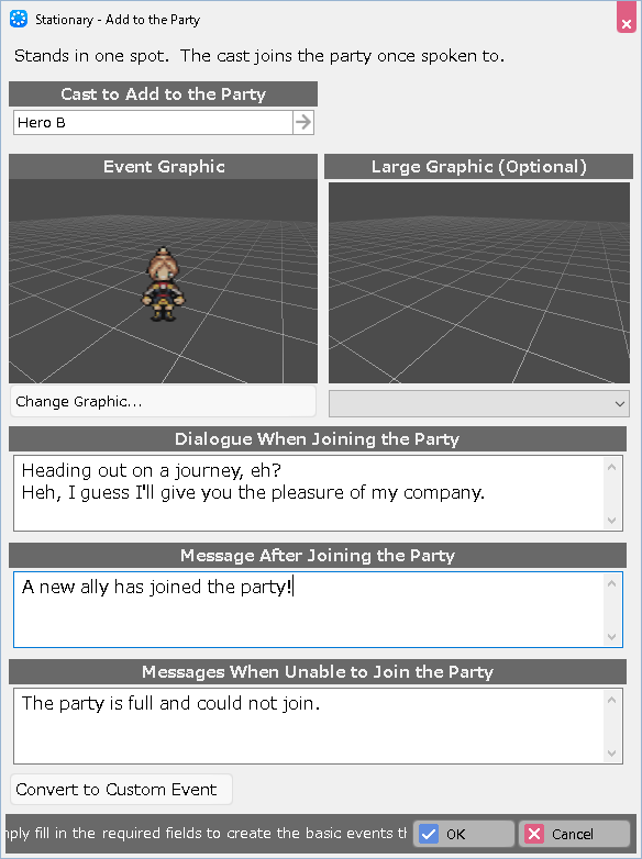 Specify the cast to add to the party, the graphic for the event, and the dialogue and messages for each situation.