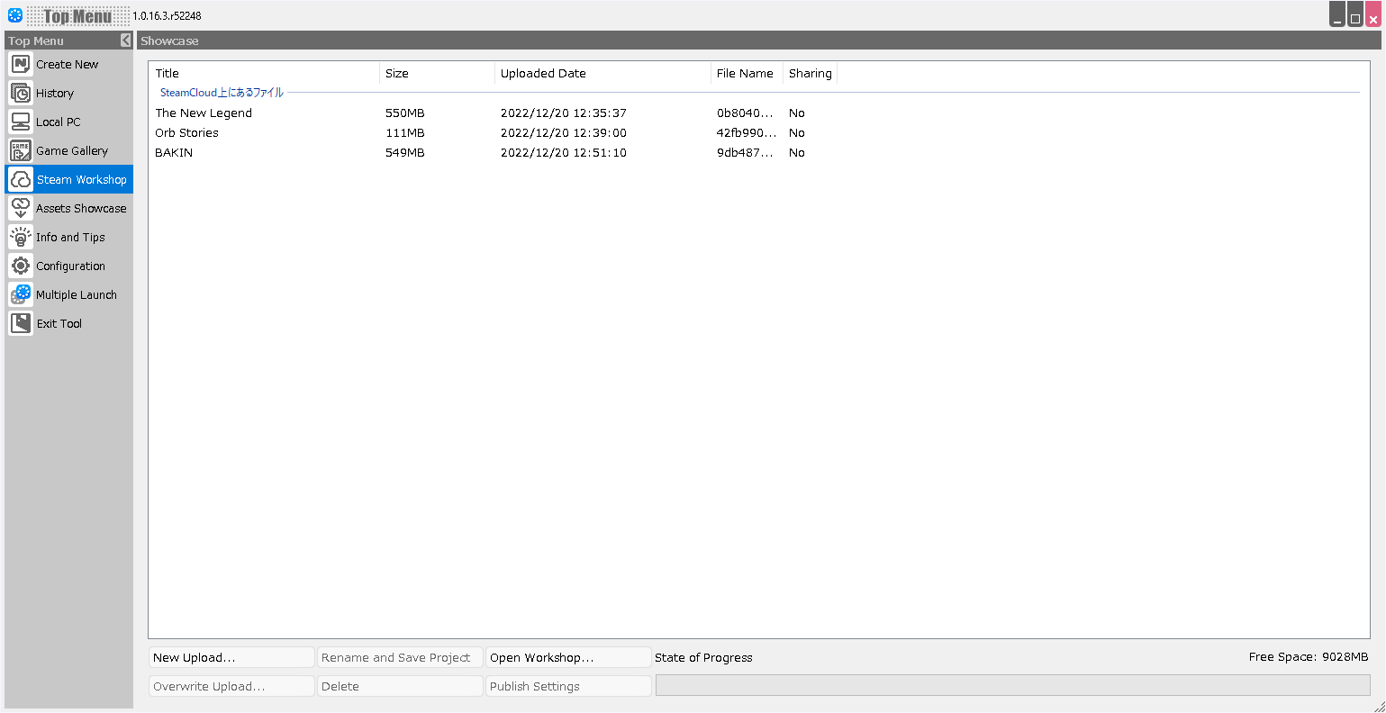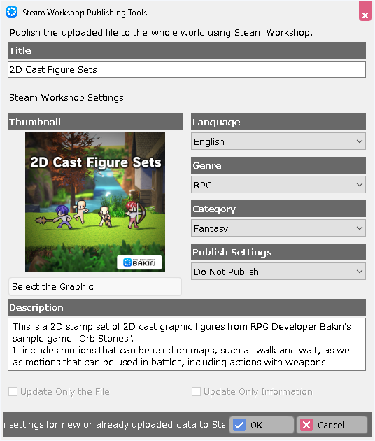 (!)Subscribers (users) of Steam Workshop should check that the date and time of the update on the Steam Workshop page for the data in question matches the date and time of the “subscribed file” in the Steam Workshop dialog of Bakin.