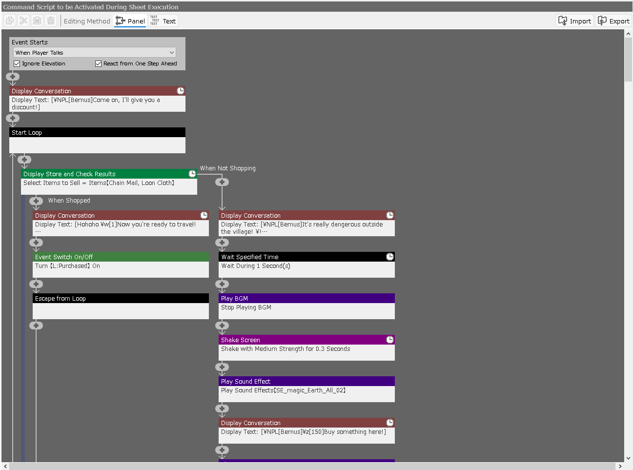 This is the screen for operating "command scripts" that combine event panels to create commands, which can be considered the main body of events.