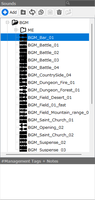 Manage sound data. sound formats available in RPG Developer Bakin are .ogg, .wav(Uncompressed PCM only).