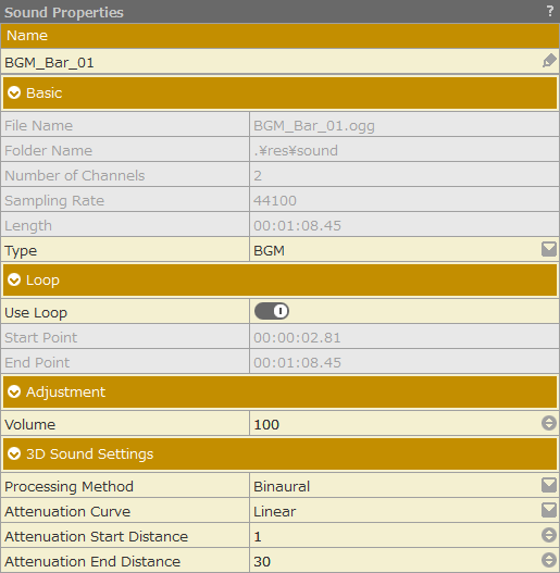 You can specify the volume of the sound within this project. This will be the default volume when adjusting the volume in events and configurations.