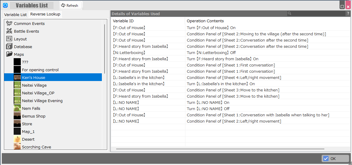 Select each map, common event, and other areas where you have identified variables used there.