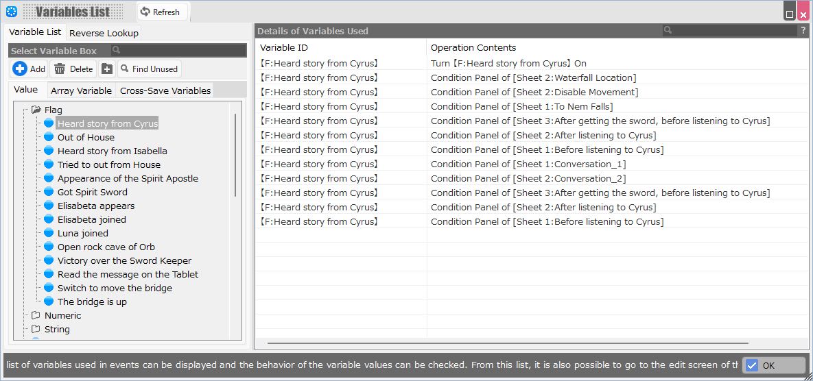 Clicking on a row opens the event sheet that uses that variable and allows you to edit the event.