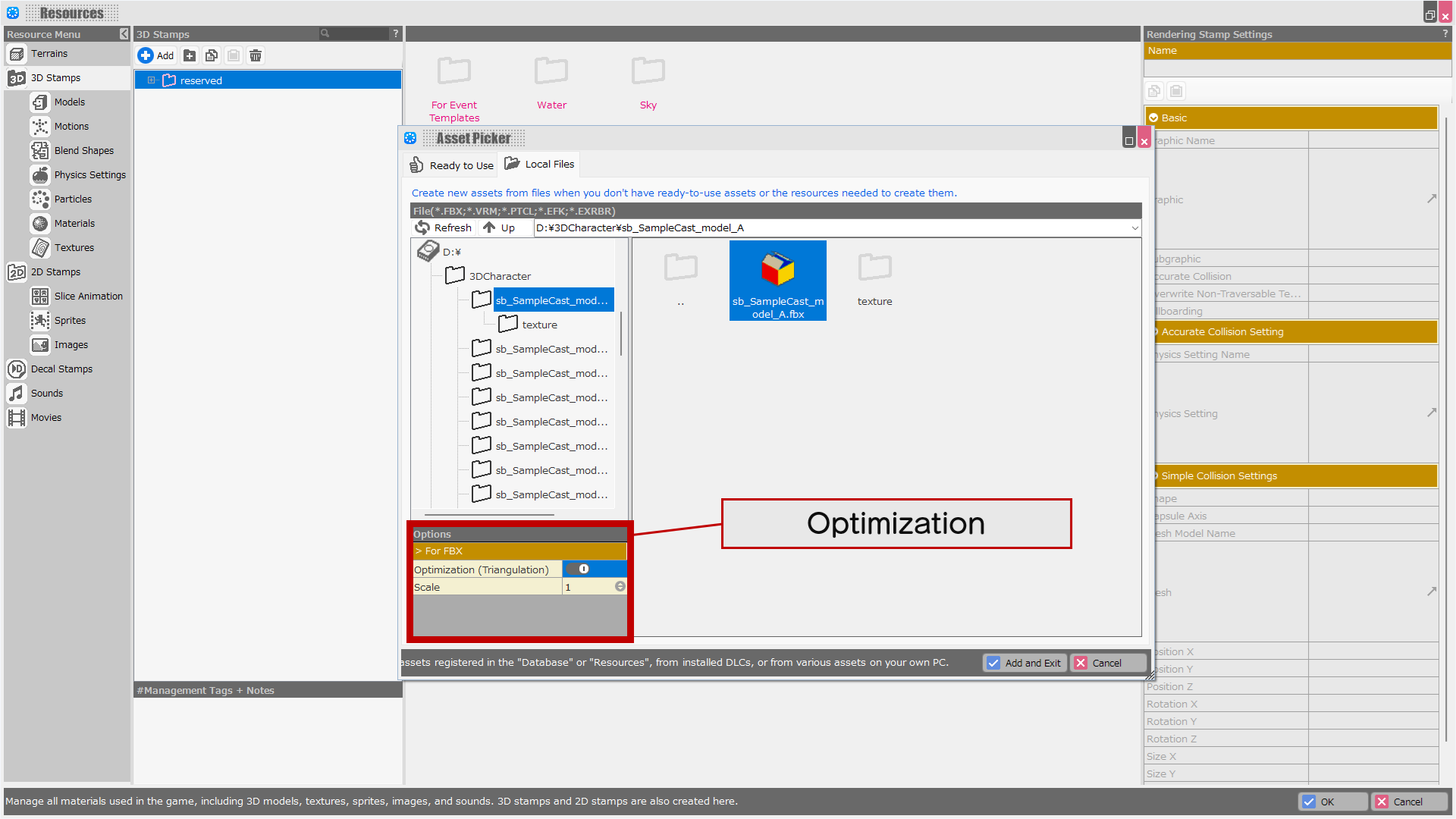 | Data Format | FBX 7.4 (FBX 2014) is recommended. Both ASCII and binary formats are supported. If you are importing models created with versions prior to FBX 7.4 (FBX 2014), you can enable the Optimization Option setting in the lower left corner of the Asset Picker when importing models into Bakin. (However, it may not be displayed correctly.) For details, see the "Import to Bakin" section below. |
