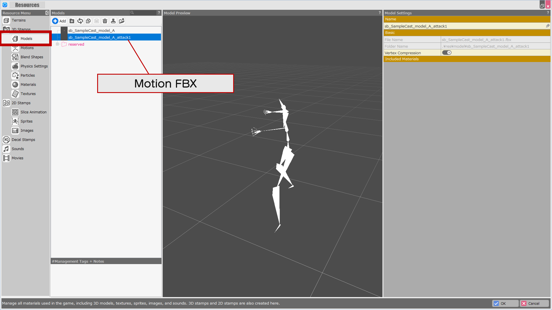 This section describes the process of adding models in FBX format and modifying motions. See .vrm Format Models for the process of adding VRM format models.