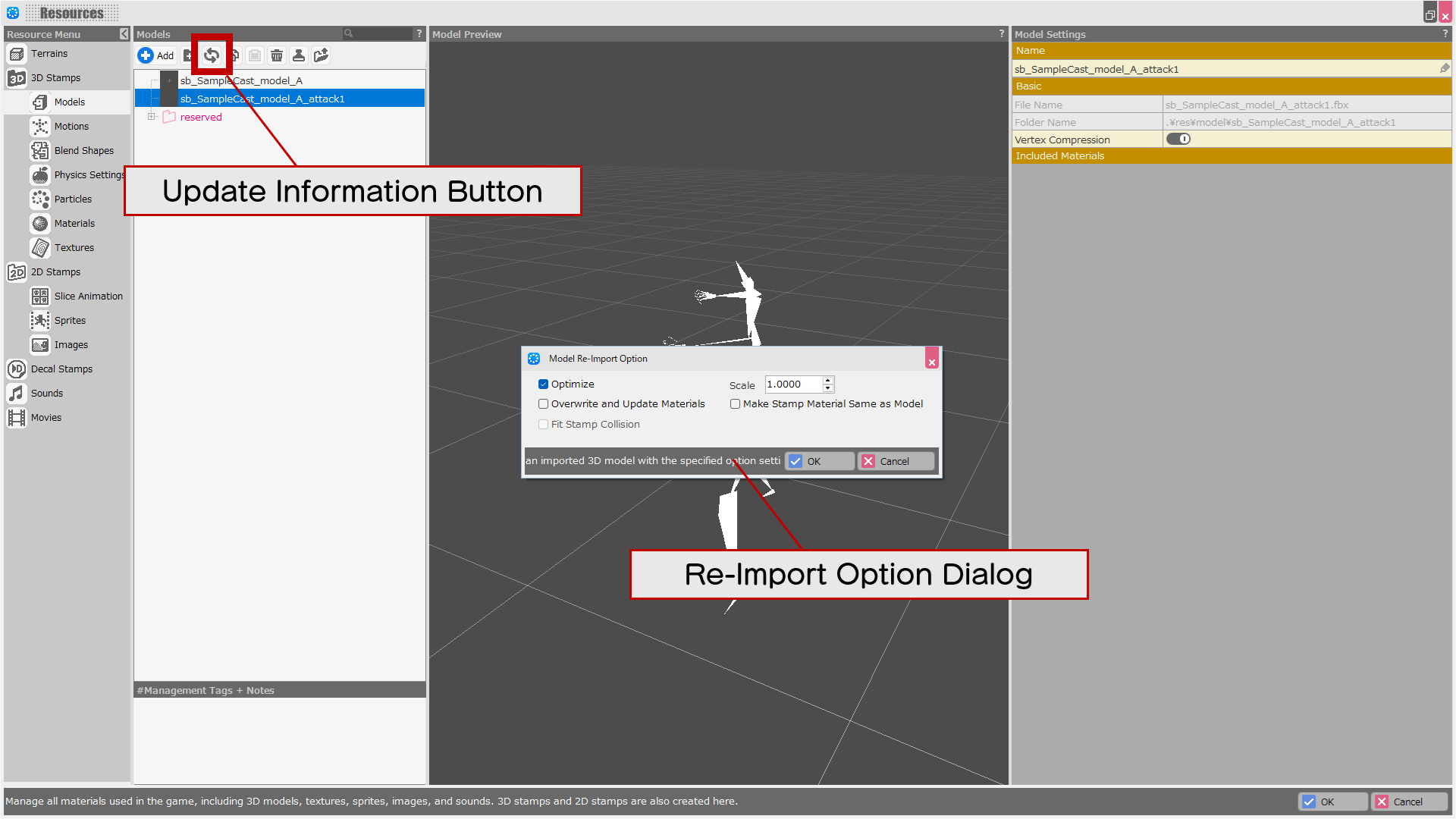After importing a model or motion into Bakin, if you have changed the content of the original FBX file, you can update the data in Bakin as follows: