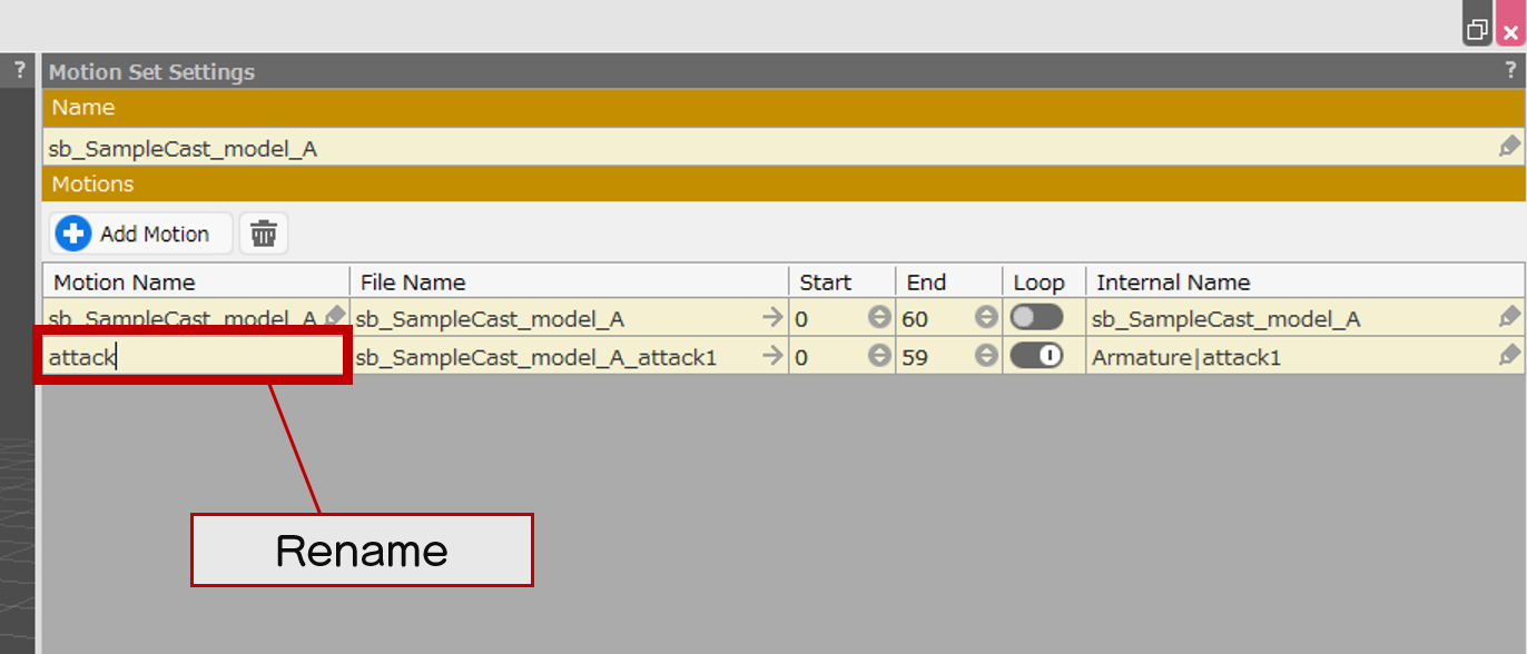 - Change the "Motion Name" of the data added to the motion list as appropriate, and set whether or not to loop.
