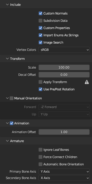 Launch Blender, select File > Import > FBX, and import with the following settings: