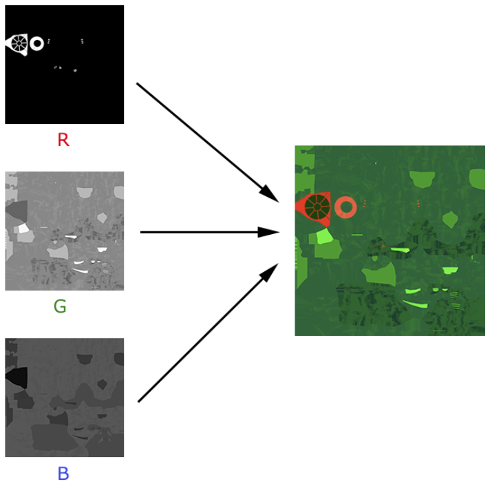 マスクマップテクスチャーのRGB(A)各チャンネルにエミッシブ、ラフネス、メタルネスを格納して作成してください。