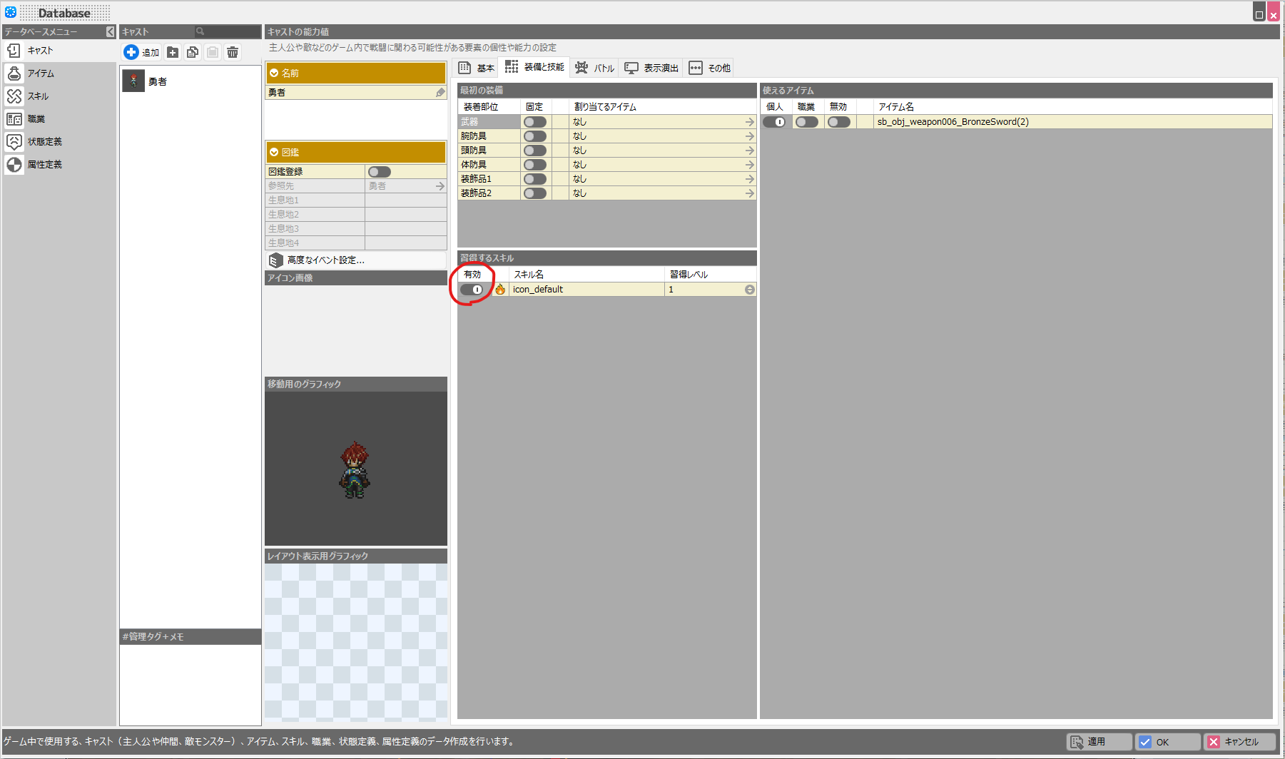 ③バトルエフェクトの設定が終わったら「データベース>スキル」で、