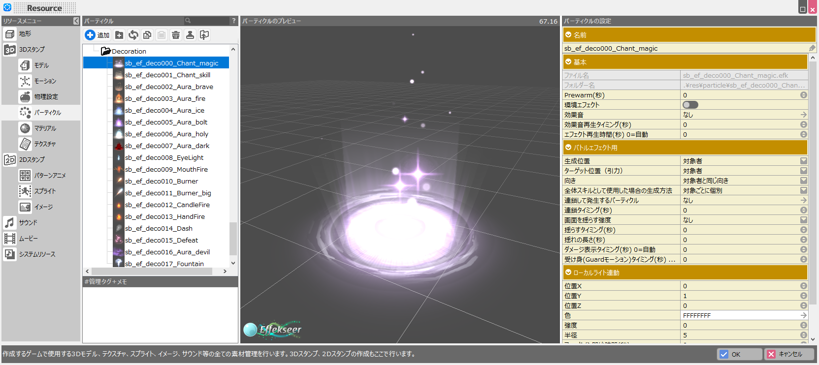 パーティクルは、エフェクト制作ツール「Effekseer」で作成したデータが使用可能です。
