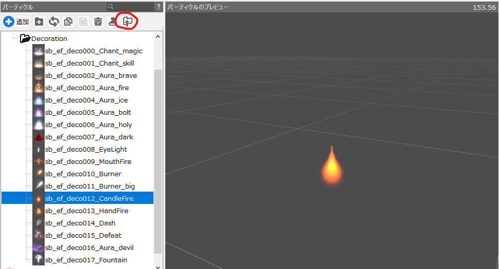(エフェクトサンプルの「sb_ef_deco012_CandleFire」をエクスポートしておいてください。)