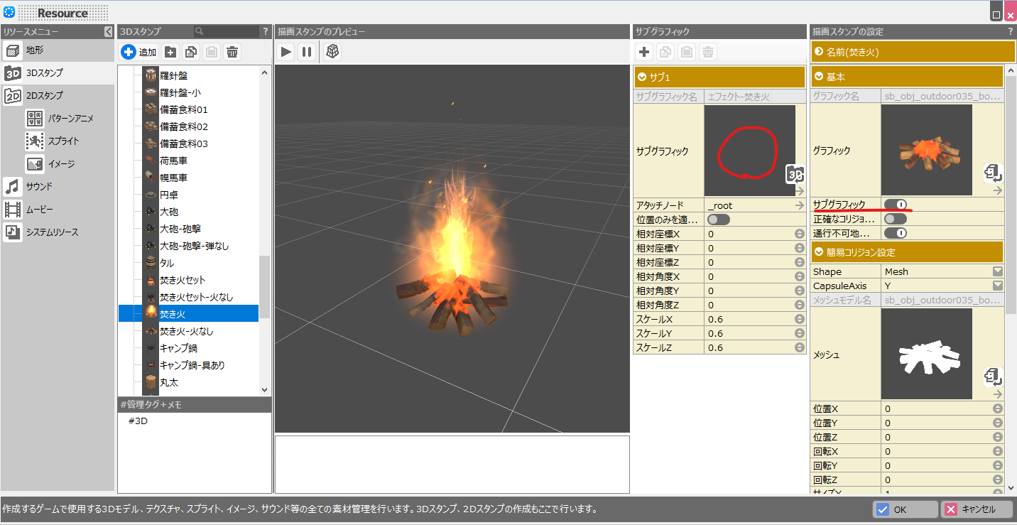 ④スタンプリストで、装飾を登録したいスタンプ(今回はキャンドルモデル)を選択し、サブグラフィックに先ほどのエフェクトスタンプを登録します。