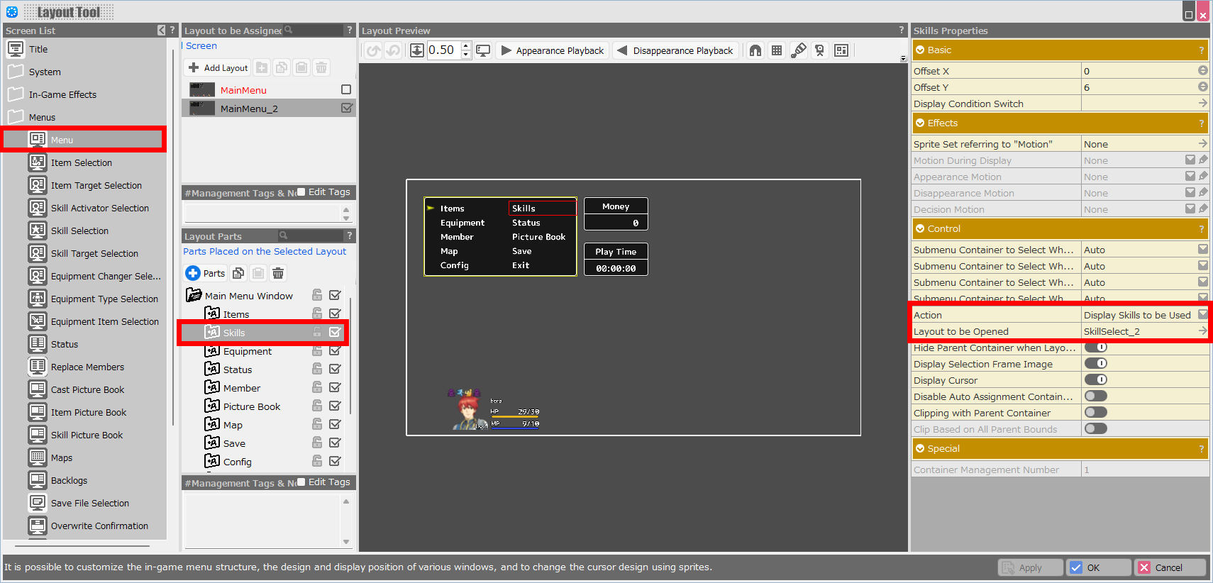 - For each submenu container that displays individual skills on the Skill Selection screen, set “Display Skills Used” as the Action, and specify the Skill Target Selection screen in Layout to be Opened.