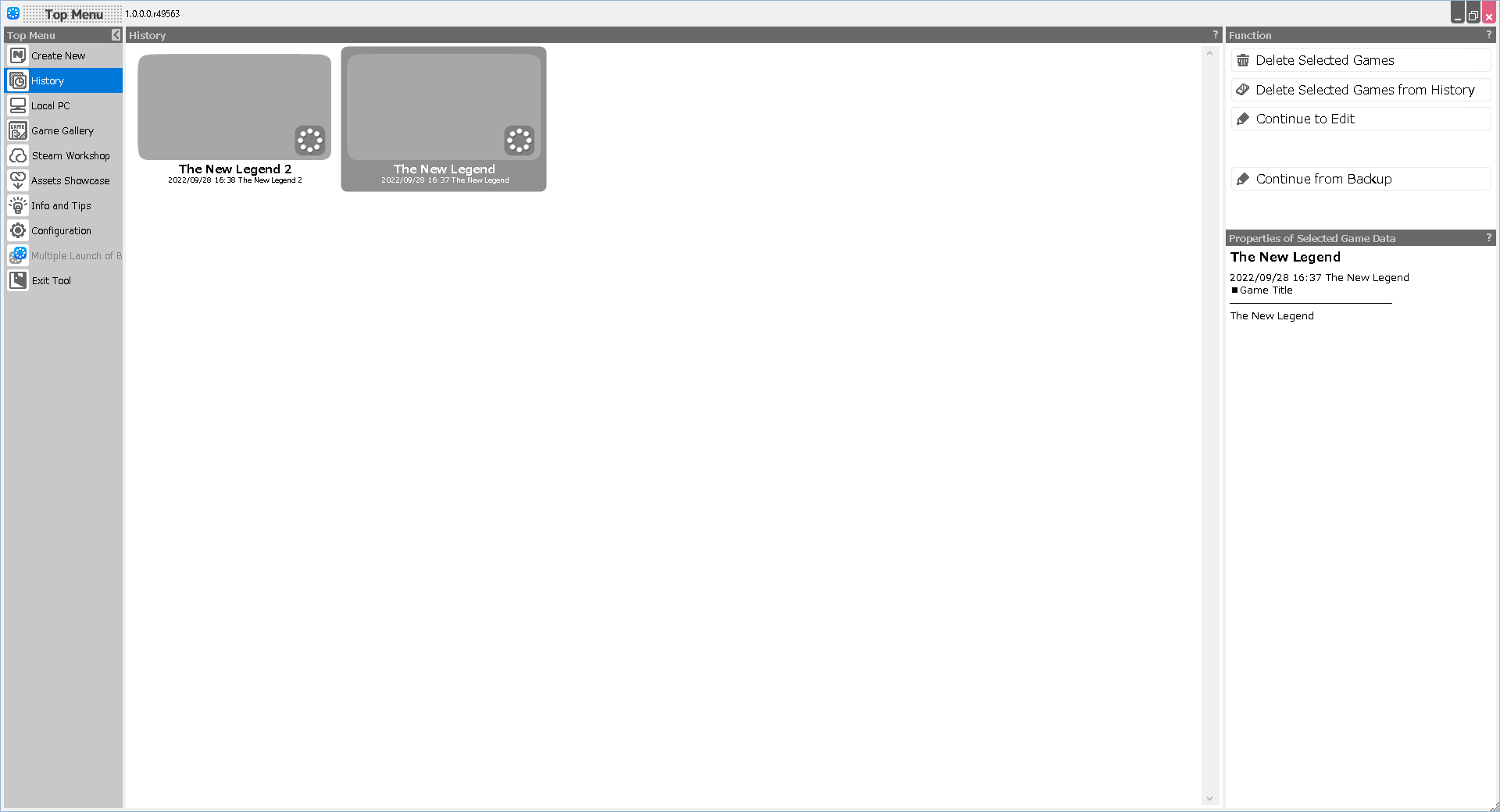 A list of game files edited so far is displayed. You can load a game file by clicking on the thumbnail or selecting any game file and then clicking on "Continue to Edit".