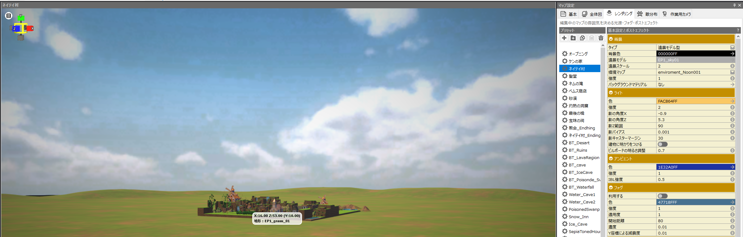 The Distant Landscape Model is a model that displays the "background" such as the blue sky, night sky, cloudy sky, etc. that are displayed outside of maps. You can specify a stamped model in [Map Settings > Rendering > Skybox Model].