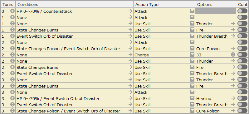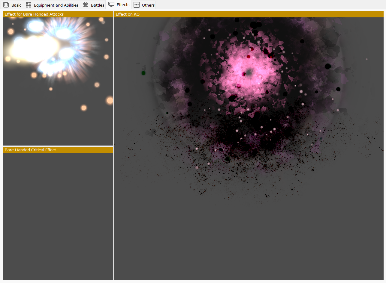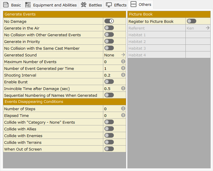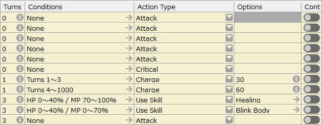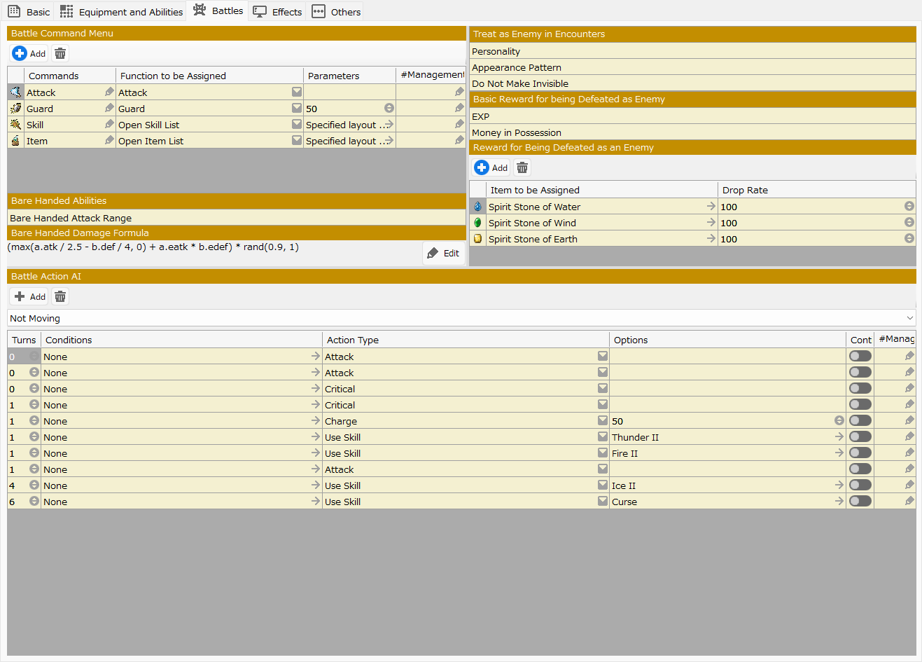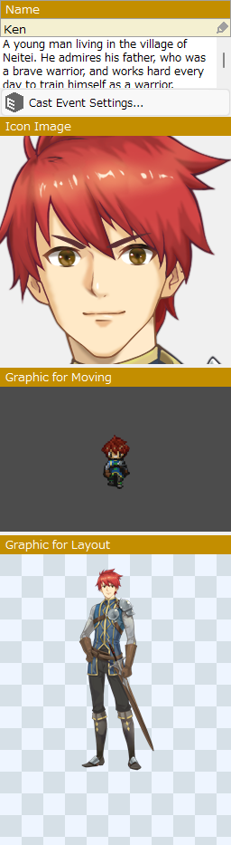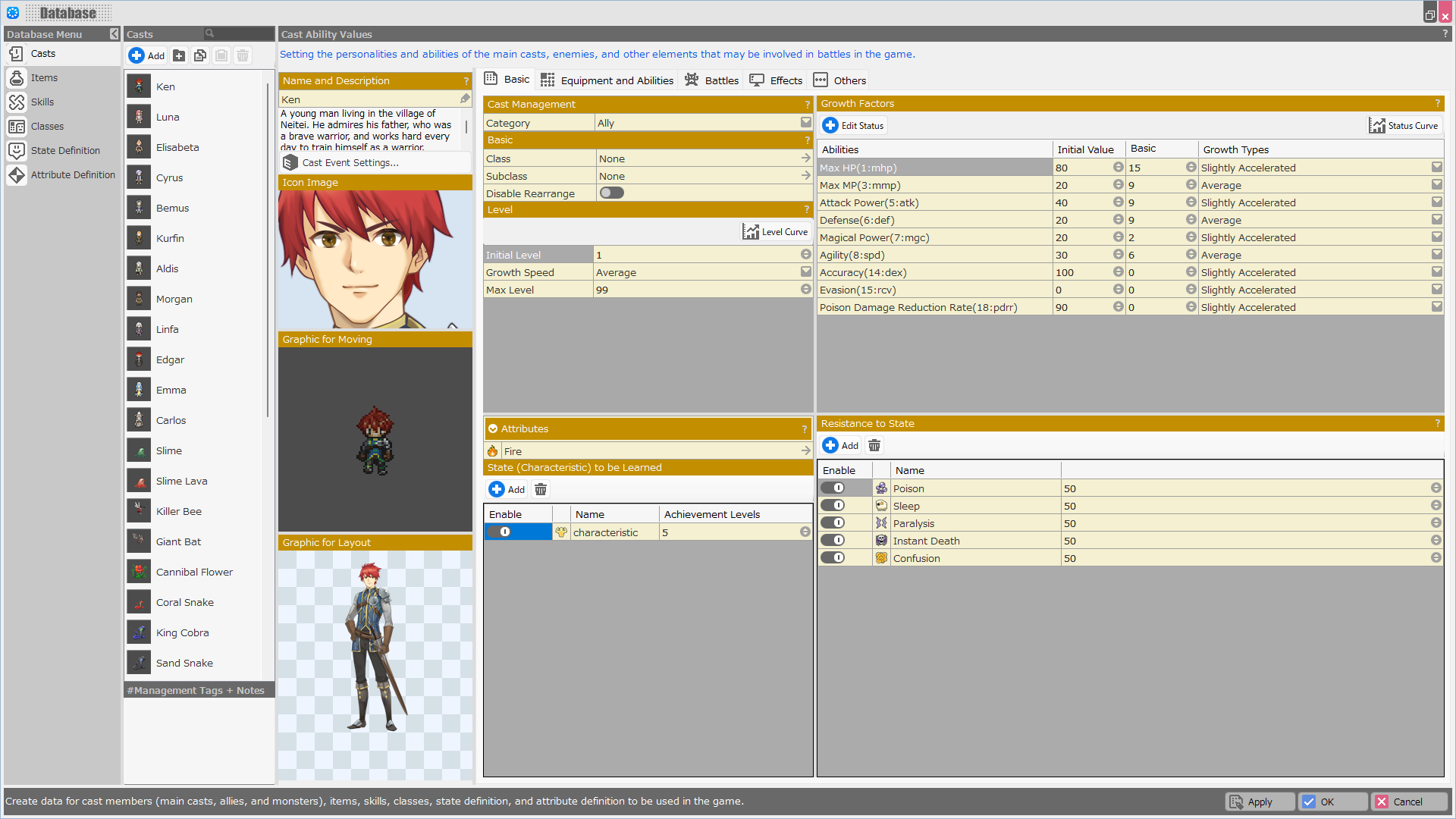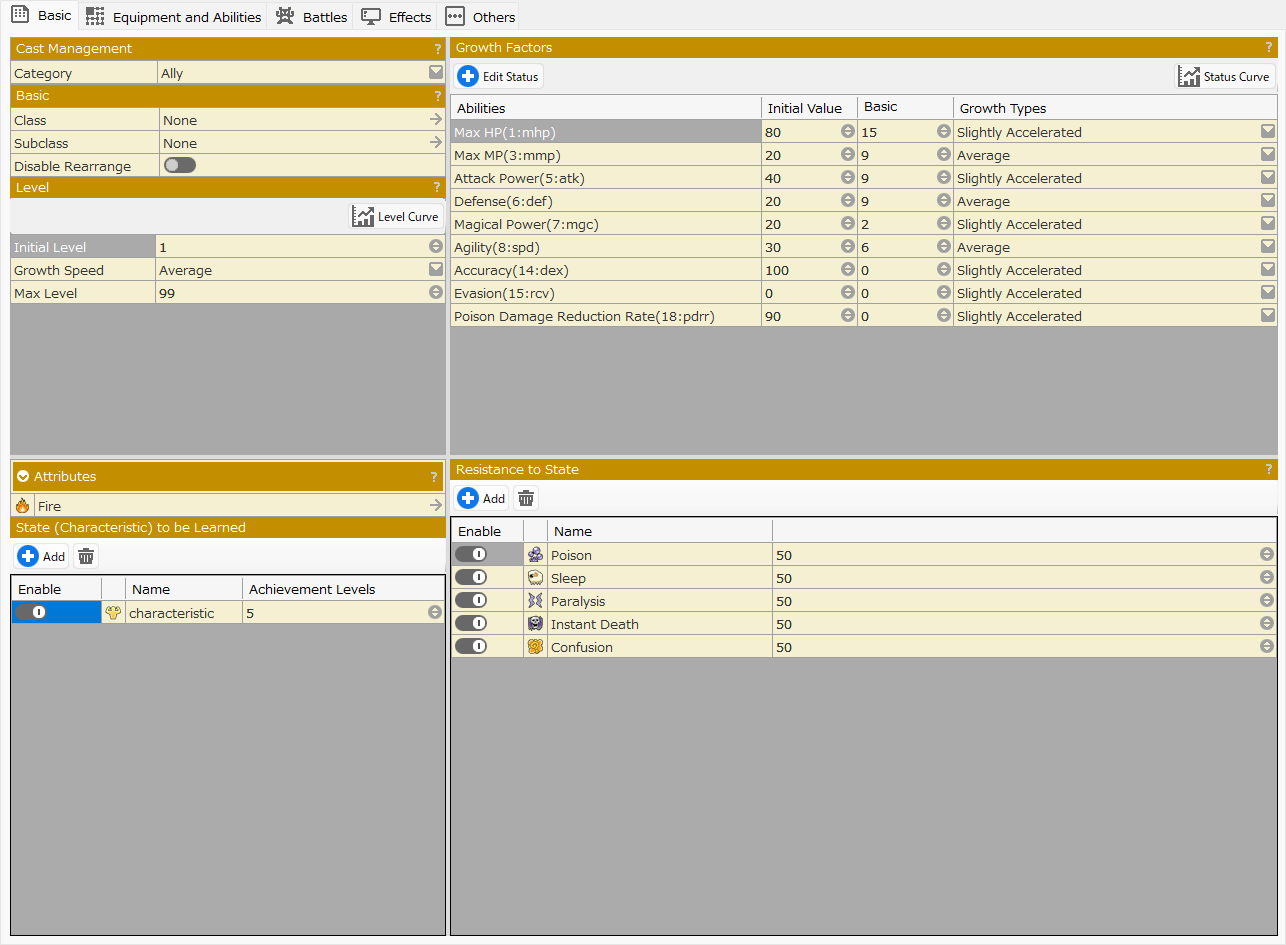 This section is mainly used to specify the basic stats of the cast, such as HP, MP, attack power, and magic, as well as the personalities and abilities of the available skills, items, and other elements that may be involved in battles in the game.