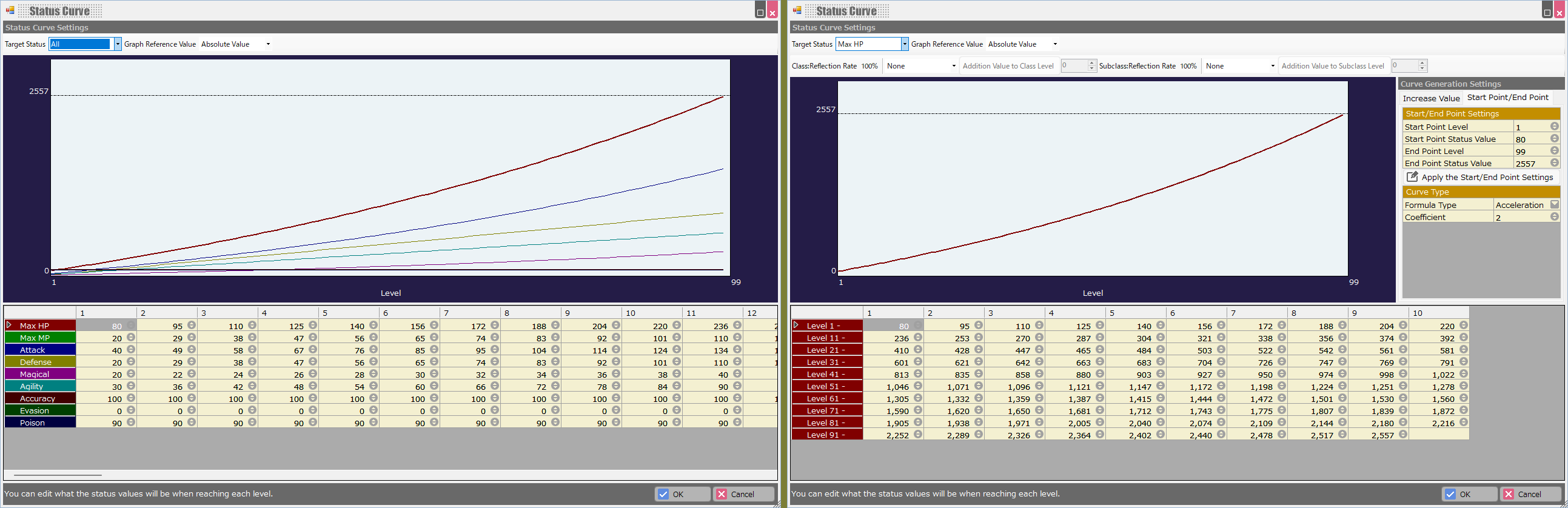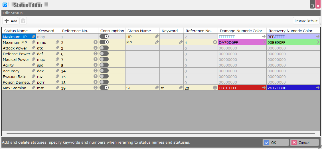 You can specify how each status changes when adding/deleting statuses and when leveling up.