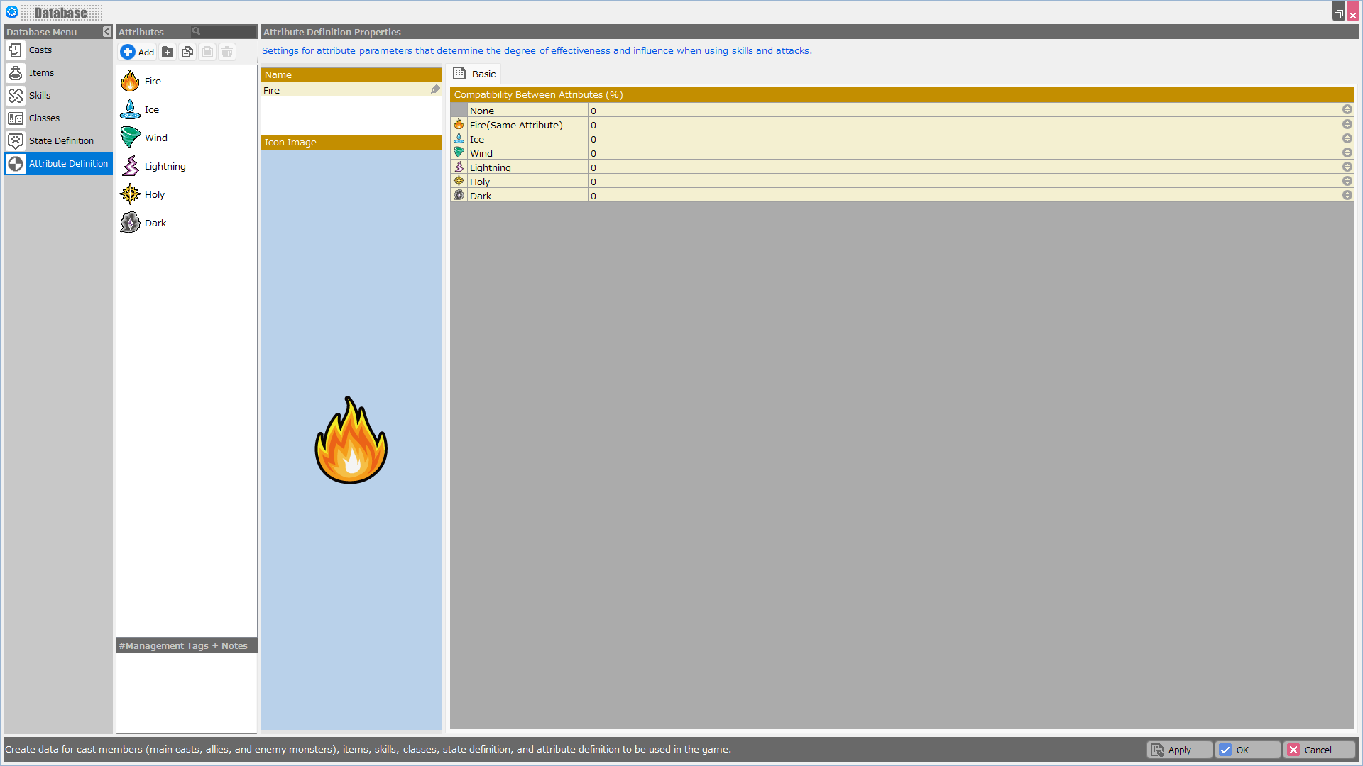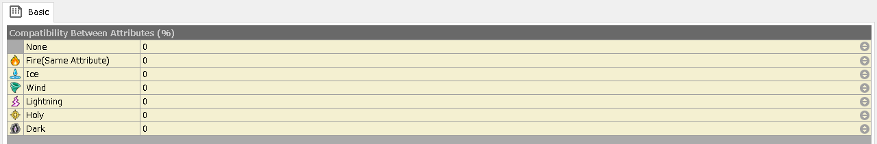 各属性に対する相性を-9999から9999の間で設定できます。数値が大きいほど、その属性に対しては強くなります。