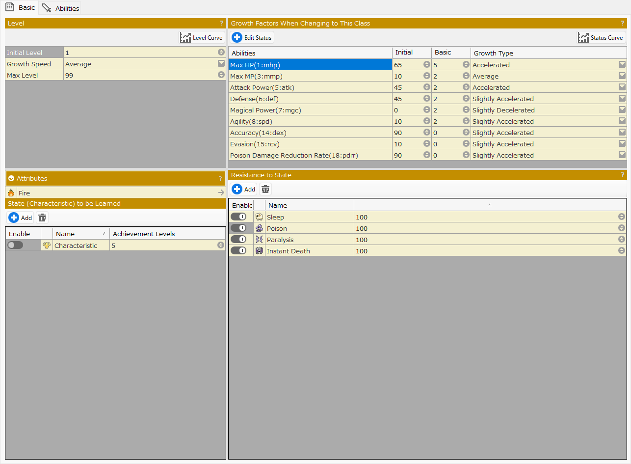 You can also adjust how much the status values of classes/subclasses are reflected in the cast-specific statuses by going to Game Definition > Game System Definition > Parameter Reflection Rate (Class/Subclass).