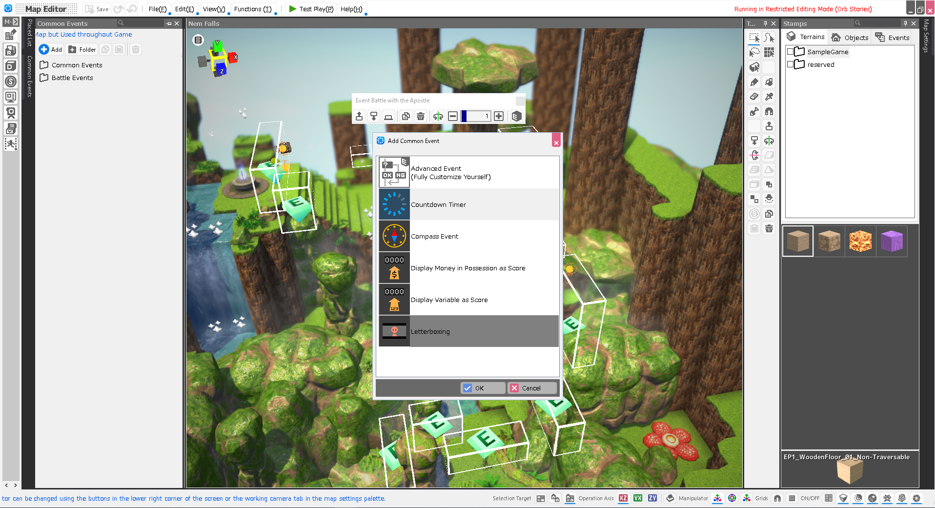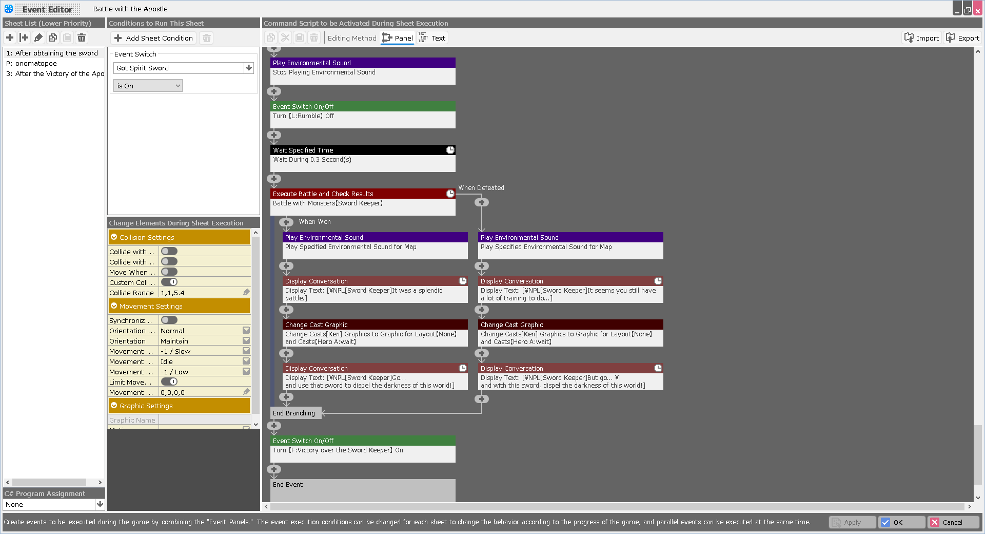 It is used to create detailed movements that cannot be achieved with event templates by combining a group of commands called an "event panels". Event templates can also be converted to "Custom events" for customization.