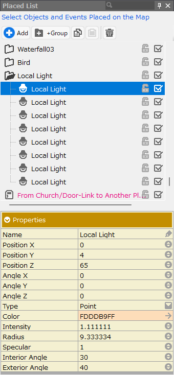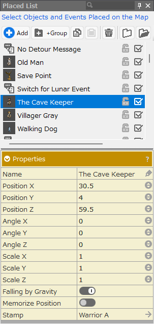 This is a list of objects and events placed on the map that can be managed in one place. From here, you can change the position and size of the object or load them into the event editor.