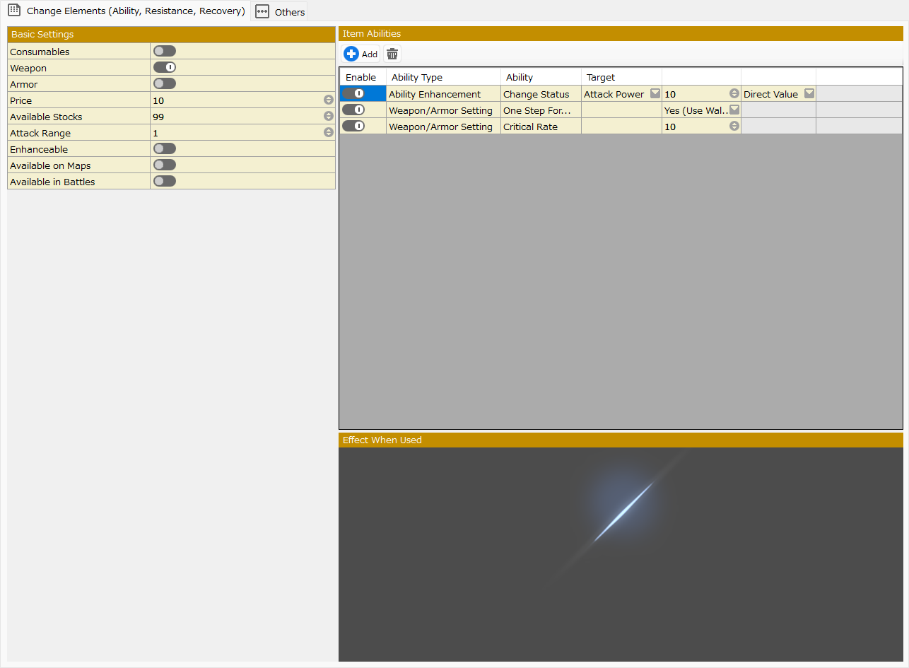 This section creates data for items used by cast members during the game, such as weapons, armor, and consumables that are used once and then lost. Each item can be individually configured with status and ability changes, as well as assigned skill abilities, and common events can be specified to set special behaviors.