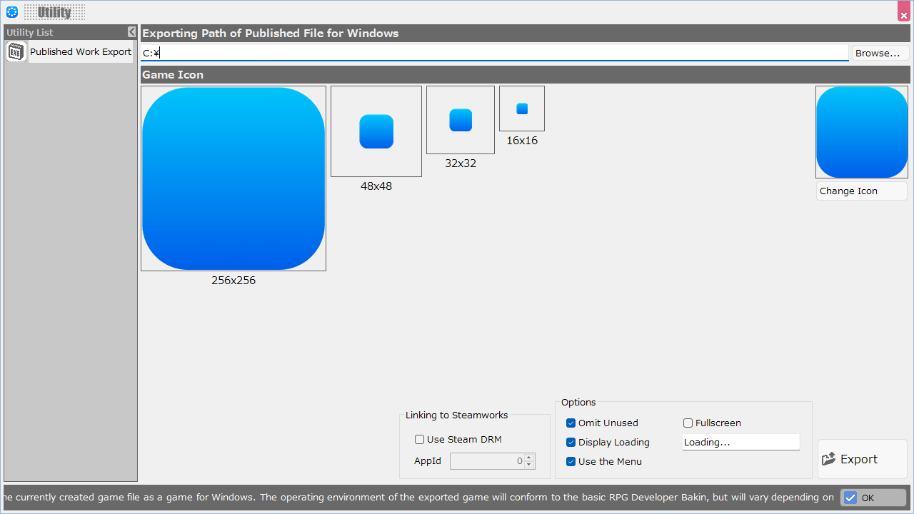This is a utility function that exports the completed game to an executable (exe) file for publication.