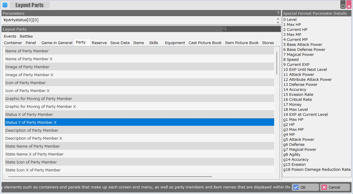 - For example, this field is not displayed in special formats that specify party members by parameters.