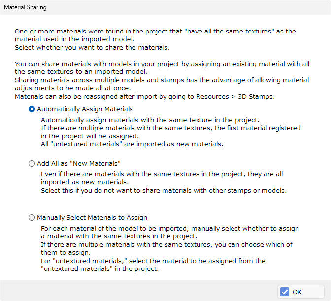 This dialog asks you to choose whether you want to assign existing materials to those materials to make them common.