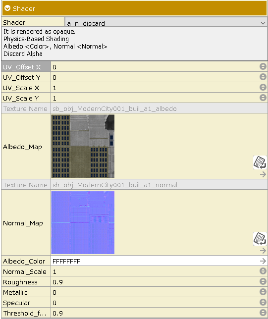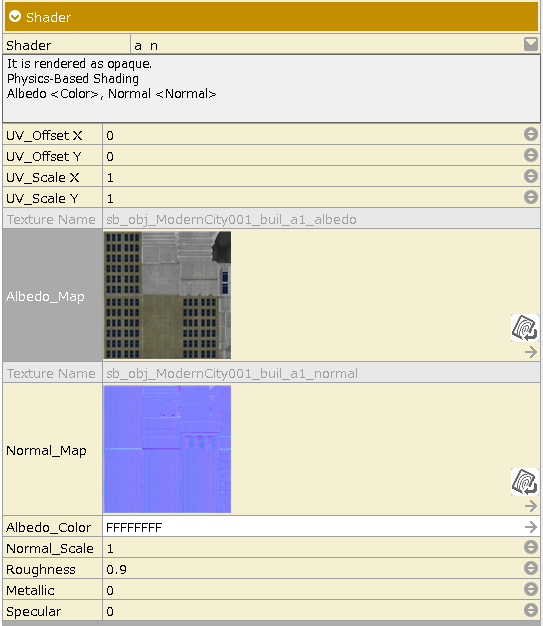 This shader uses physics-based shading with an albedo map and a normal map available for setting.