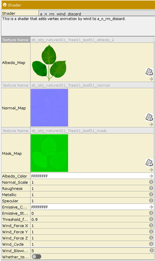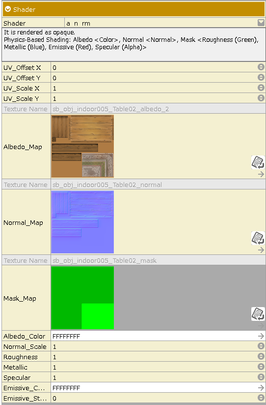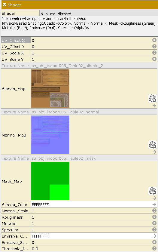 This shader uses physics-based shading with an albedo map, a normal map and a mask map available for setting.