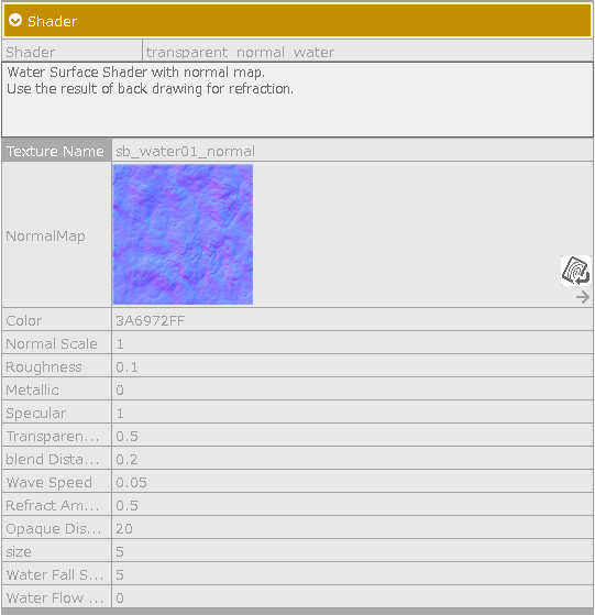 - Water Fall Speed: When this shader is applied to a mesh extending in the Y direction, water will flow from top to bottom like a waterfall, and to specify the speed at which the water surface falls.