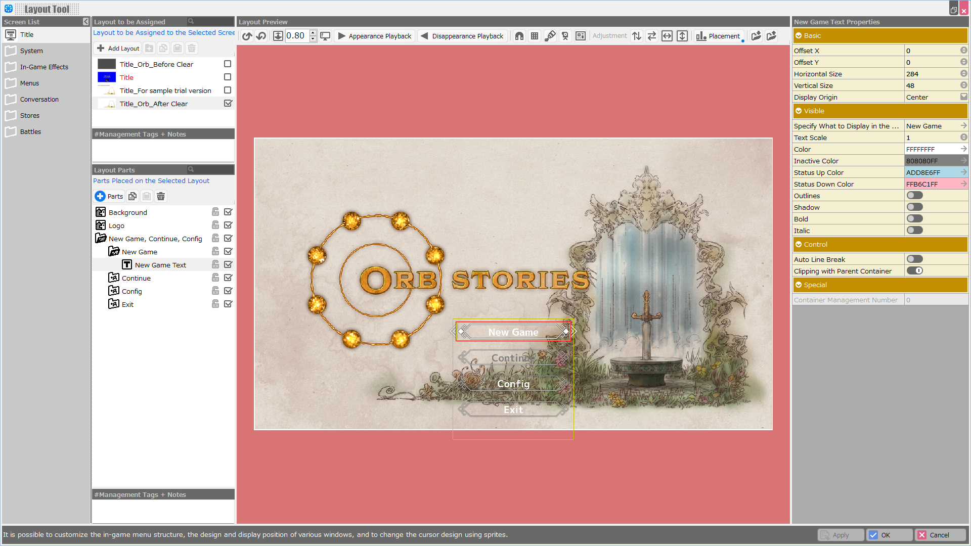 For example, a game title screen is assigned a layout called "Title," which is made up of several layout parts such as "Background" and "Title Name.