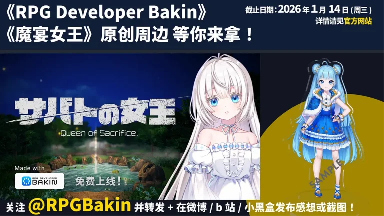 赠送《RPG Developer Bakin》软件+《魔宴女王 Queen of Sacrifice.》角色亚克力立牌 :各社交媒体平台5名,共计15名。