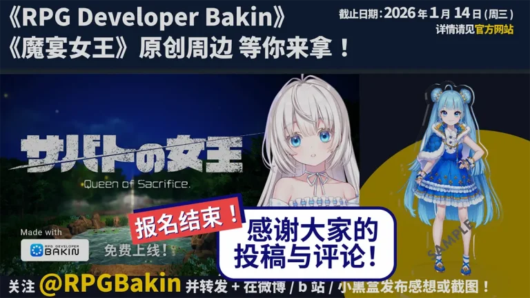 关注Bakin官方社交媒体账号并转发活动指定帖文,即可参与抽奖。我们将从各平台分别抽取1位幸运用户(共计3名),赠送《RPG Developer Bakin》软件一份。此外,若您在社交媒体分享游戏感想或截图等内容,还有机会参与第二轮抽奖。我们将从各平台分别抽取5位用户(共计15名),赠送《RPG Developer Bakin》软件及《魔宴女王 Queen of Sacrifice.》原创周边商品。