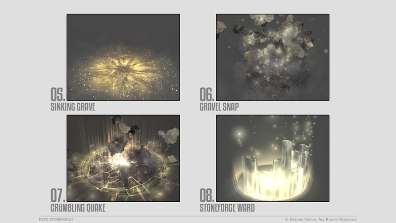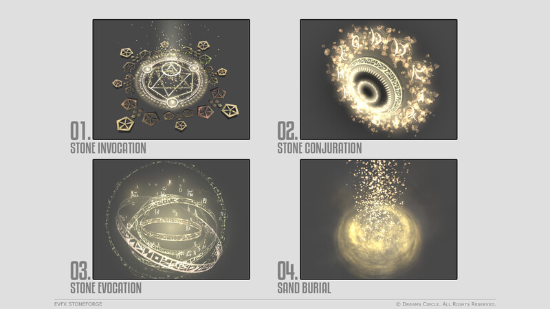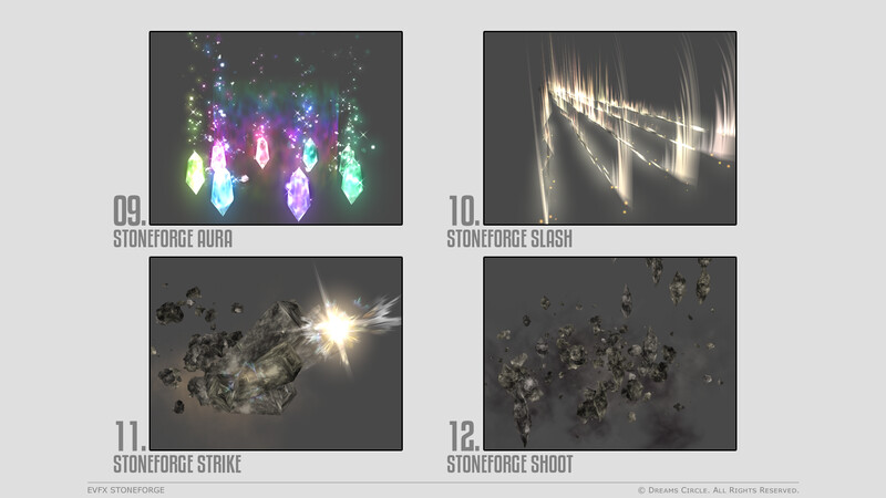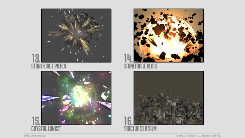 《EVFX Stoneforge》由专注于制作高品质游戏素材的团队Dreams Circle设计,是一款收录了16种精美视觉特效及其对应音效的特效素材包。